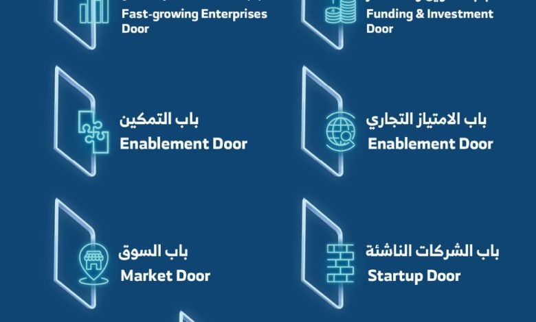 أما باب الشركات الناشئة فيوفر بيئة متكاملة تربط أصحاب المشاريع بالمستثمرين والحاضنات والمسرعات، في حين يركّز باب المنشآت متسارعة النمو على دعم المنشآت في تجاوز مسارها المتوقع وتحقيق مستويات أعلى من التوسع، ويمنح باب السوق رواد الأعمال فرصة مباشرة لعرض منتجاتهم وخدماتهم والترويج لابتكاراتهم.
