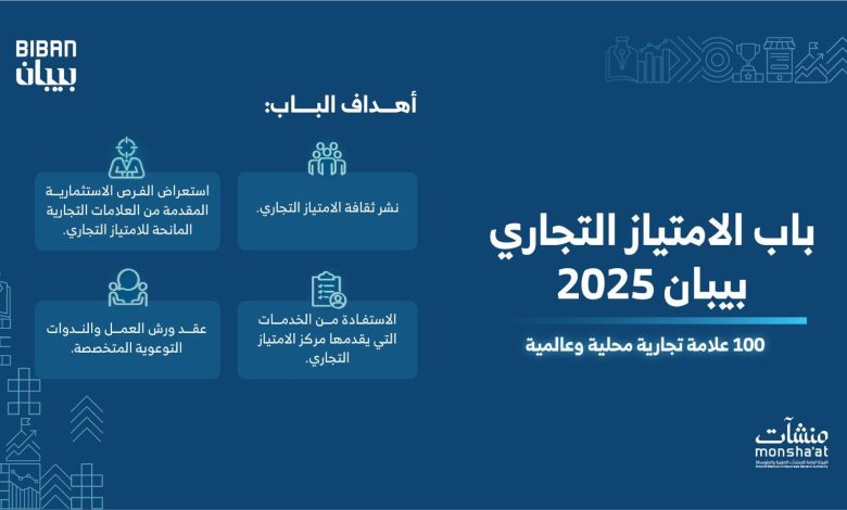 ويهدف “بيبان 2025” من خلال باب الامتياز التجاري إلى نشر ثقافة الامتياز التجاري بوصفه نموذجًا تجاريًا فاعلًا يقدم مجموعة من الخدمات والأنشطة؛ التي من أبرزها التعرف على الفرص الاستثمارية المقدمة من العلامات التجارية المانحة للامتياز التجاري في مختلف القطاعات، الاستفادة من الخدمات التي يقدمها مركز الامتياز التجاري، إلى جانب حضور ورش العمل والندوات التوعوية المتخصصة، والجلسات الاستشارية التي يقدمها خبراء ومستشارون محليون ودوليون.